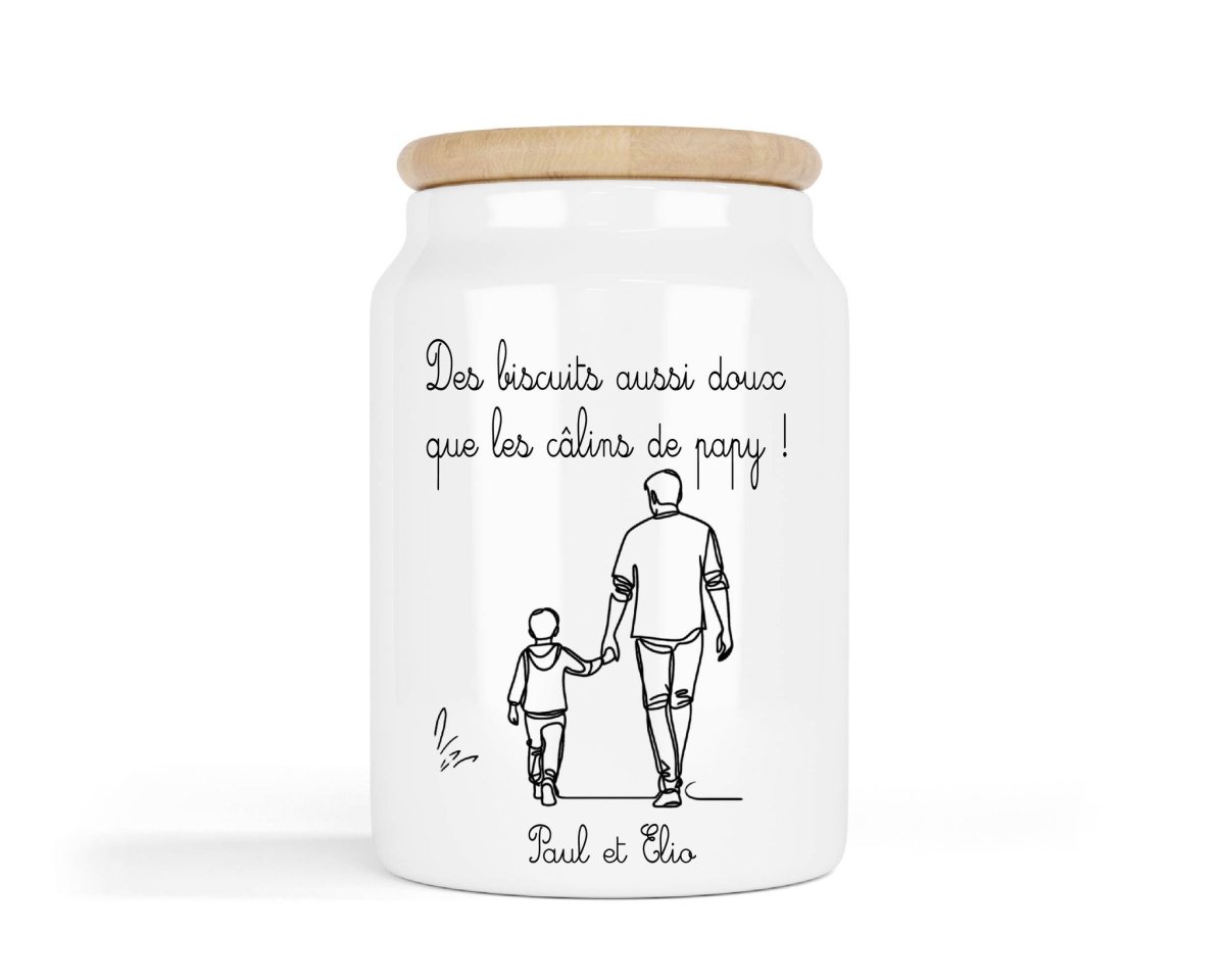 🌸 Préparez-vous à ravir votre Papy adoré avec notre élégant pot à biscuits, le cadeau parfait pour la fête des Papy ! 🍪 Avec une hauteur de 145 mm et une contenance généreuse de 650 ml, ce pot à biscuits est non seulement fonctionnel mais aussi un objet de décoration charmant pour sa cuisine ou son salon. Son design doux et accueillant apporte une touche de chaleur à n’importe quel espace. 💖 Gravé avec le mot « Papy « , ce pot à biscuits devient un symbole de l’amour et de l’appréciation que vous avez pour lui. Chaque fois qu’il ouvre ce pot pour savourer ses délicieux biscuits faits maison, elle se souviendra de l’affection que vous lui portez. 🌟 Que ce soit pour ranger ses biscuits préférés, des bonbons ou même des petits accessoires de cuisine, ce pot à biscuits est à la fois pratique et émouvant, ajoutant une touche spéciale à ses moments de gourmandise. 🎁 Offrez-lui ce présent adorable et fonctionnel pour lui montrer à quel point elle compte pour vous. Faites de la fête des Papy un moment inoubliable en lui offrant ce pot à biscuits qui allie beauté, praticité et amour. ✨ Avec notre pot à biscuits « Papy « , vous offrez bien plus qu’un simple récipient, vous offrez un témoignage tangible de votre affection et de votre gratitude envers la mamie qui illumine votre vie ! Possible de rajouter le prénom des enfants