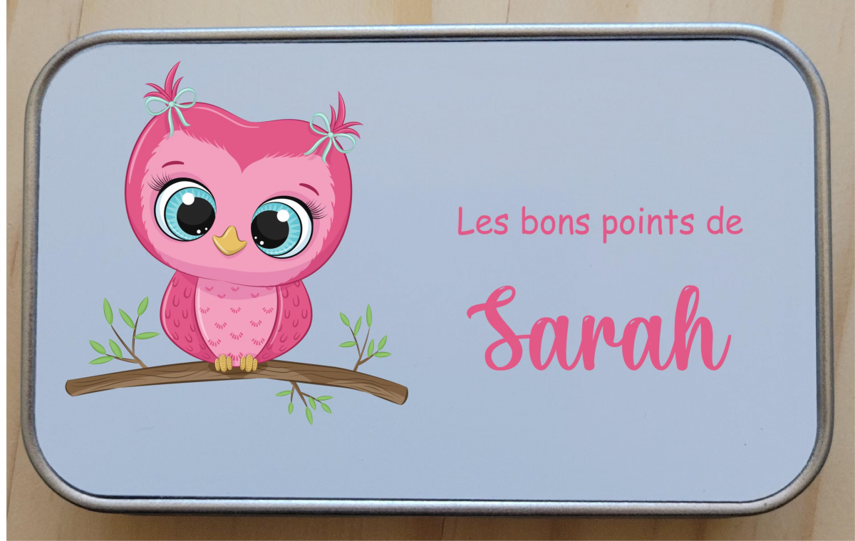 🦉 Boîte à bons points personnalisée – Motif Hibou rose sur sa branche