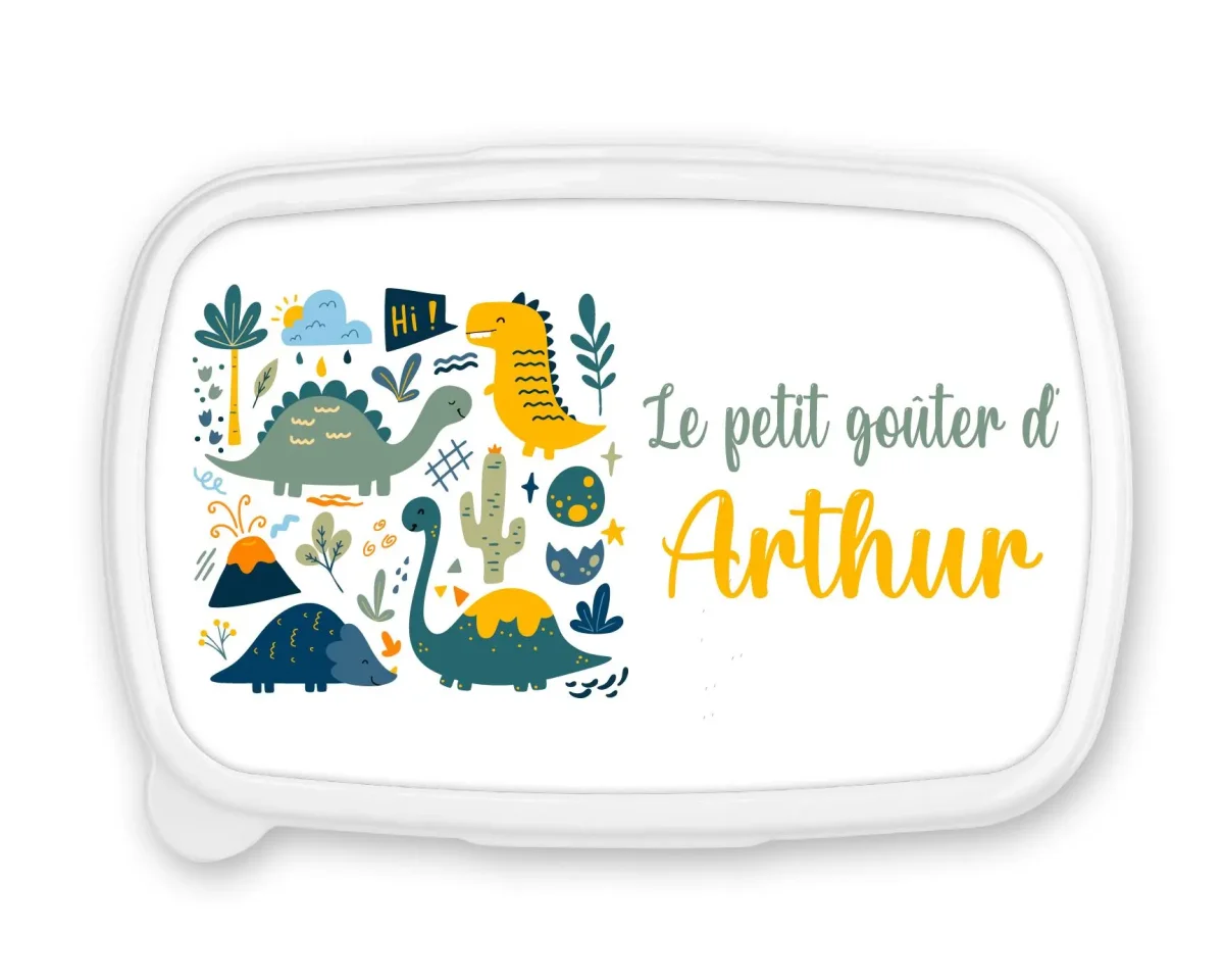 Une rentrée préhistorique pleine de fun avec cette boîte à goûter personnalisée au prénom de votre enfant, décorée de dinosaures colorés et rigolos ! Sur un fond bleu, elle est parfaite pour les petits fans de T-Rex, tricératops et diplodocus 🦕.