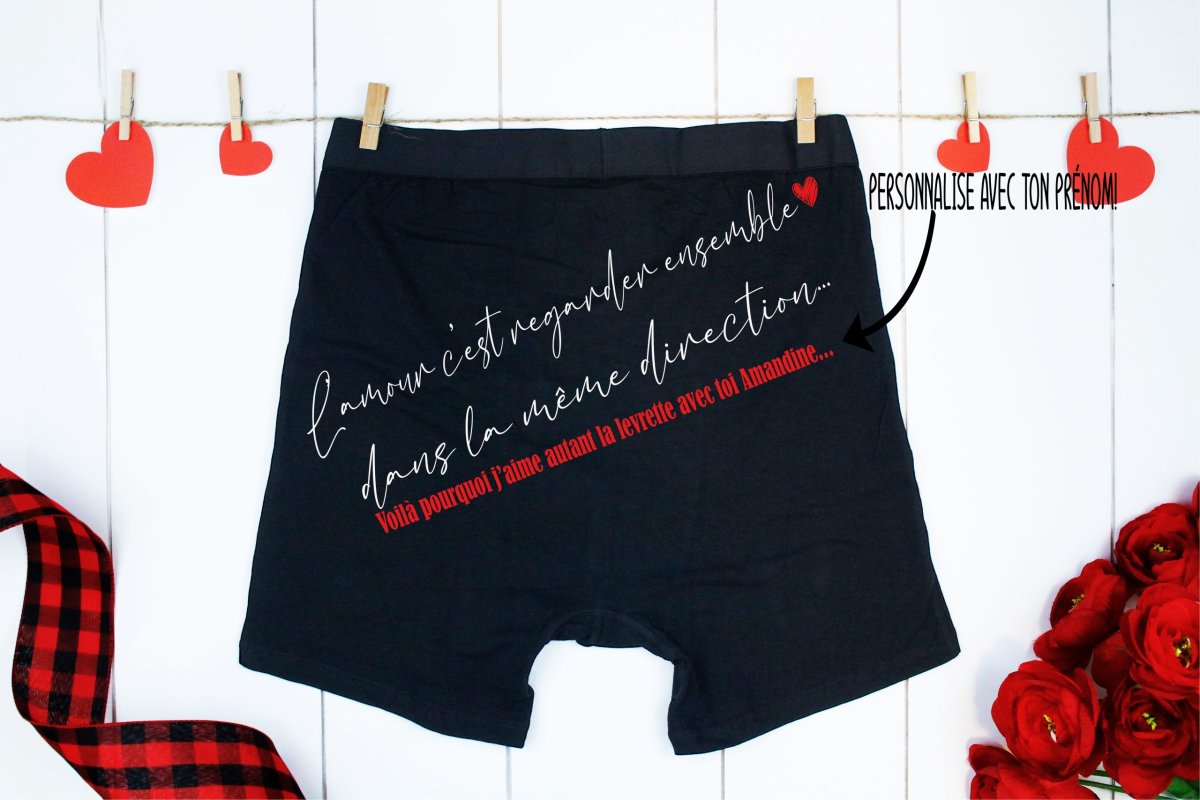 Ajoutez une touche d’humour et de sensualité à vos moments intimes avec ce boxer noir , décorée du message « L’amour c’est regarder ensemble dans la même direction ». Vous pouvez personnaliser ce message en remplaçant [Prénom] par le nom de votre choix, créant ainsi un cadeau vraiment unique et intime.