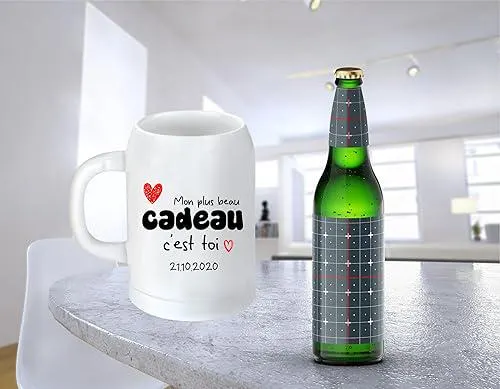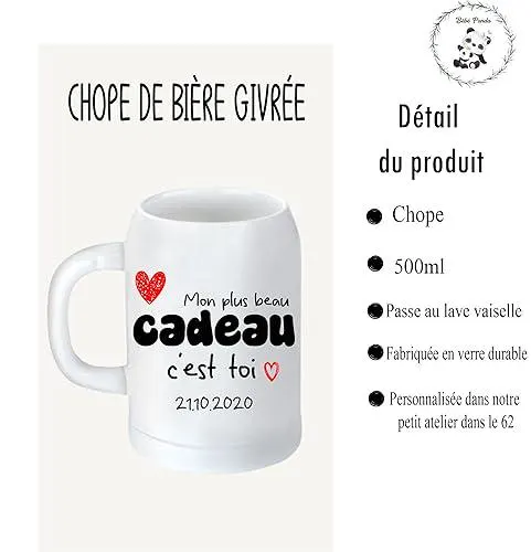 Offrez un cadeau romantique et personnalisé avec cette chope de bière de 500 ml gravée du message « Mon plus beau cadeau c’est toi », avec la possibilité de personnaliser en dessous avec la date de rencontre. Ce cadeau unique est parfait pour la Saint-Valentin, un anniversaire de rencontre, ou toute autre occasion spéciale à célébrer avec votre moitié.
