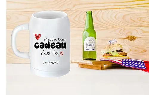 Idée Cadeau pour Saint-Valentin : Ce mug personnalisé est un cadeau romantique idéal pour la Saint-Valentin. Le message « Mon plus beau cadeau c’est toi », accompagné de la date de rencontre, fait de cette chope de bière un souvenir précieux à chaque gorgée. Ce cadeau unique rappellera à votre partenaire l’importance de cette journée spéciale dans votre histoire d’amour.