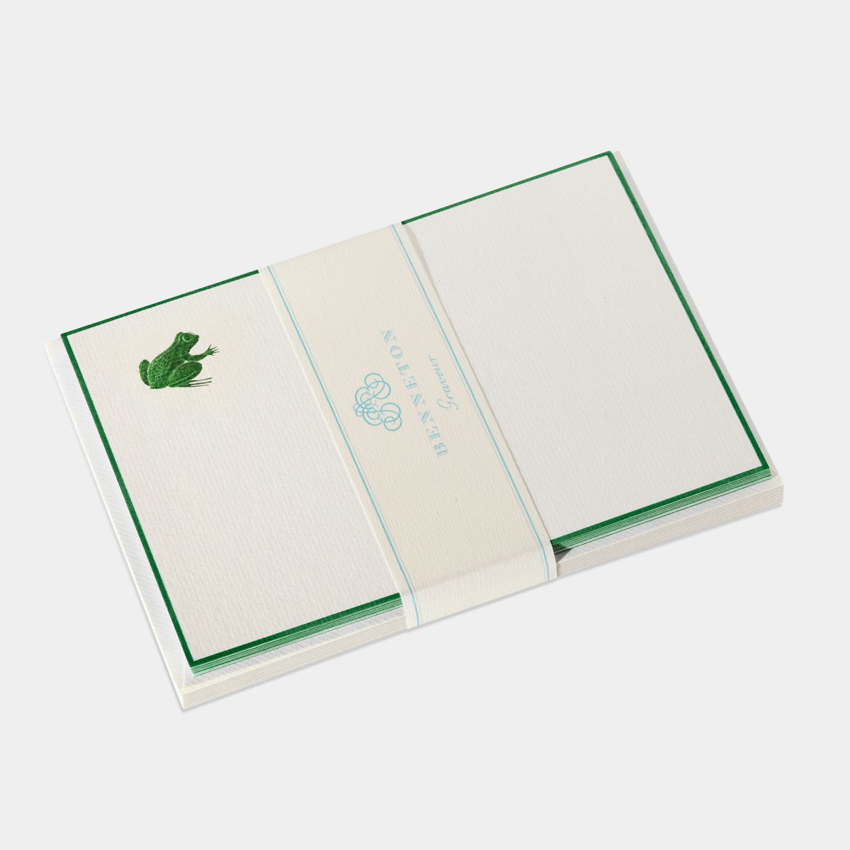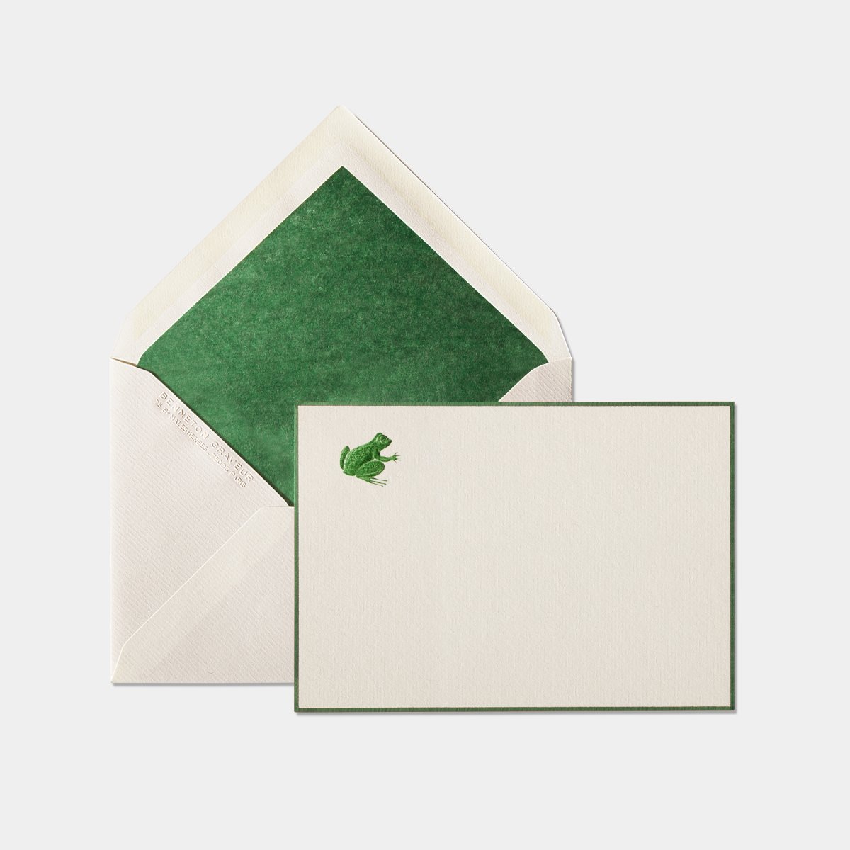 Les cartes de correspondance « grenouille » de la collection Benneton comme toutes nos cartes aux motifs floraux, animaliers et fantaisie sont timbrées à la main sur presse à bras, carte par carte selon la technique dite du « timbrage brossé ».