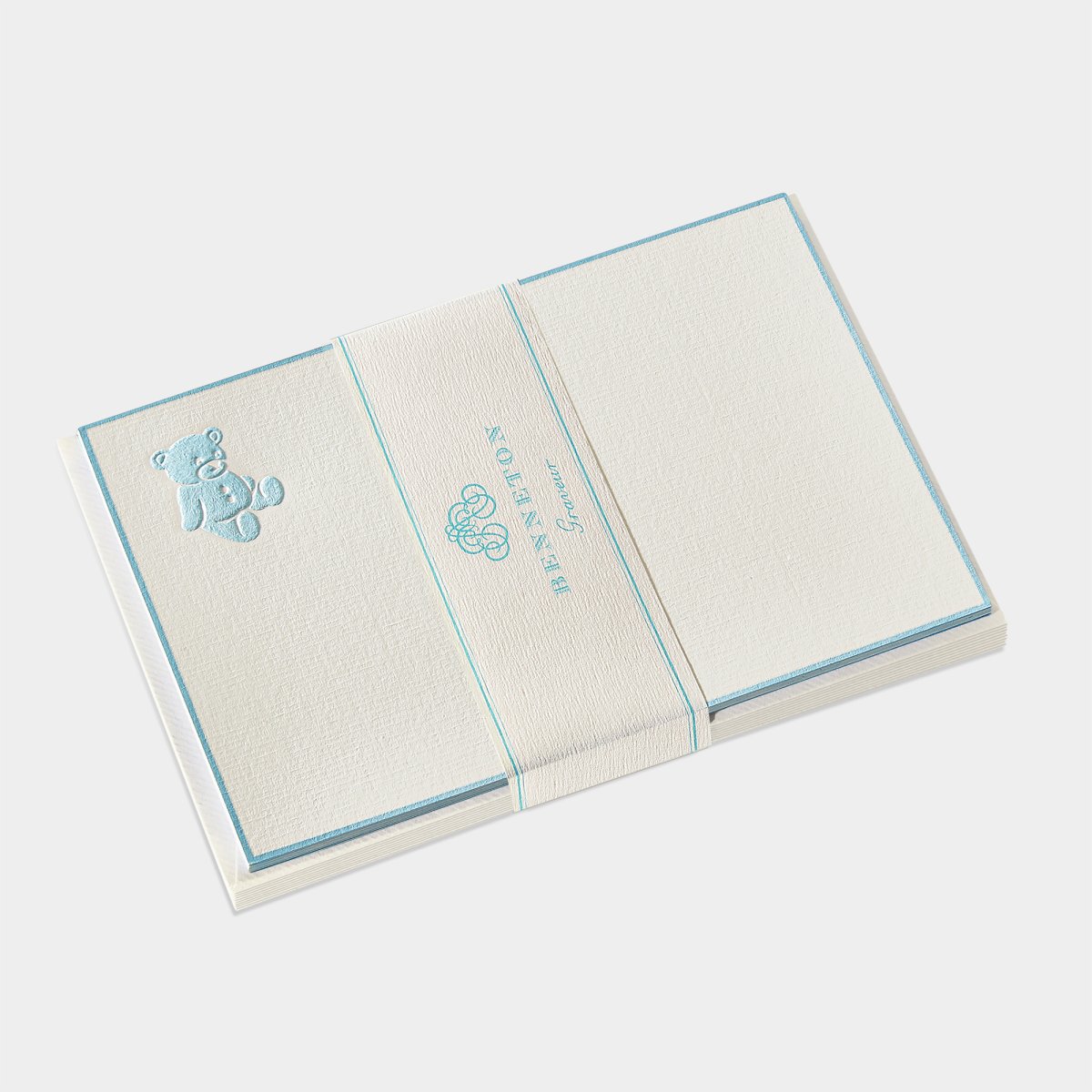 Les cartes de correspondance « ourson tom » de la collection Benneton comme toutes nos cartes aux motifs floraux, animaliers et fantaisie sont timbrées à la main sur presse à bras, carte par carte selon la technique dite du « timbrage brossé ».