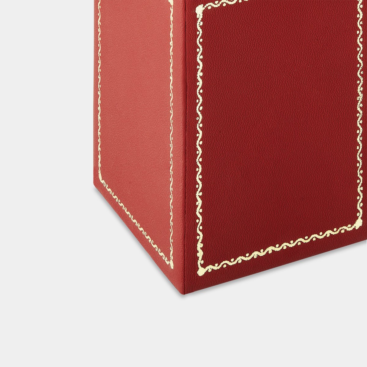 Rectangular pencil holder in dark red calfskin leather with vignette; gold embellishment around the edges.