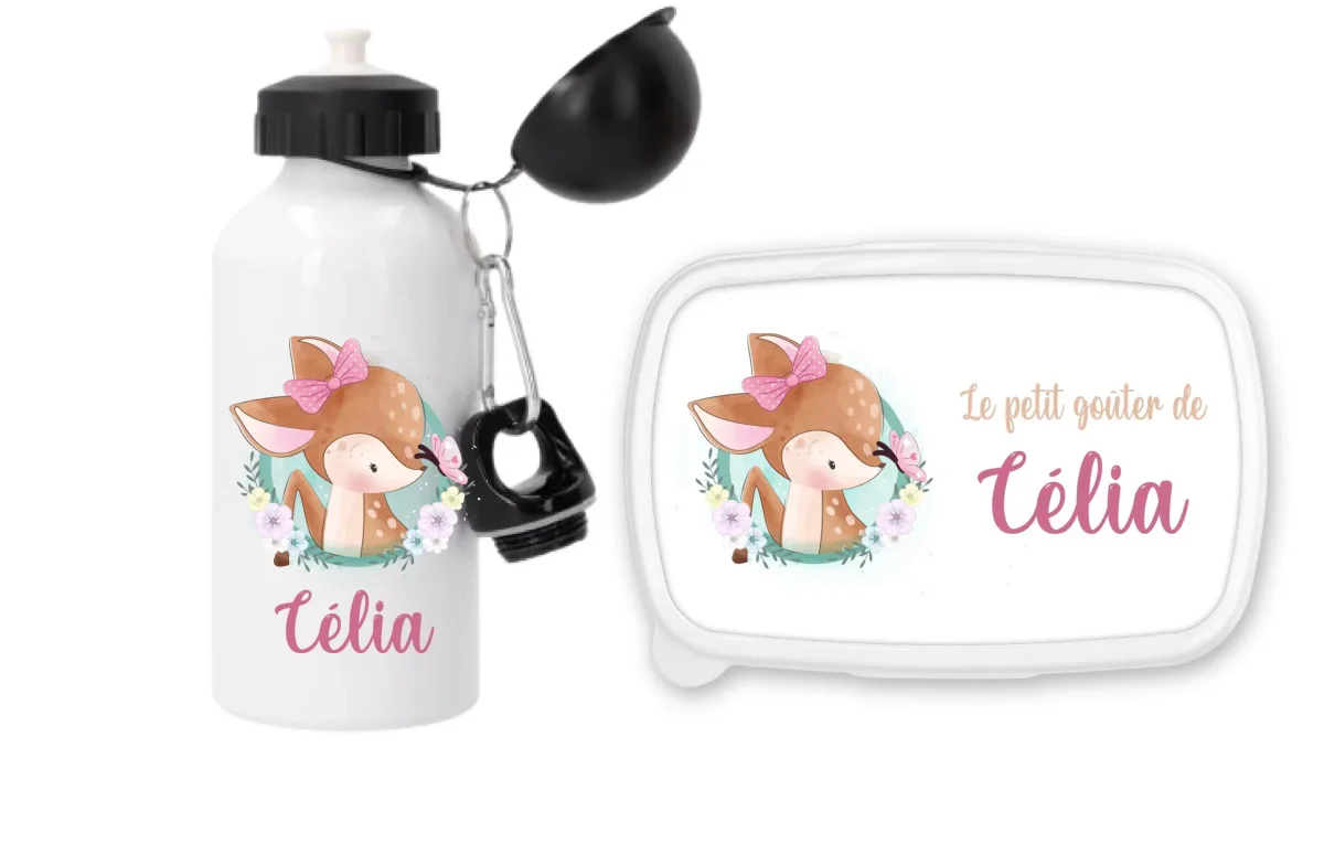 Le tout décoré d’un motif doux et féérique : une petite biche accompagnée d’un papillon et de fleurs, pour les amoureux de la nature.