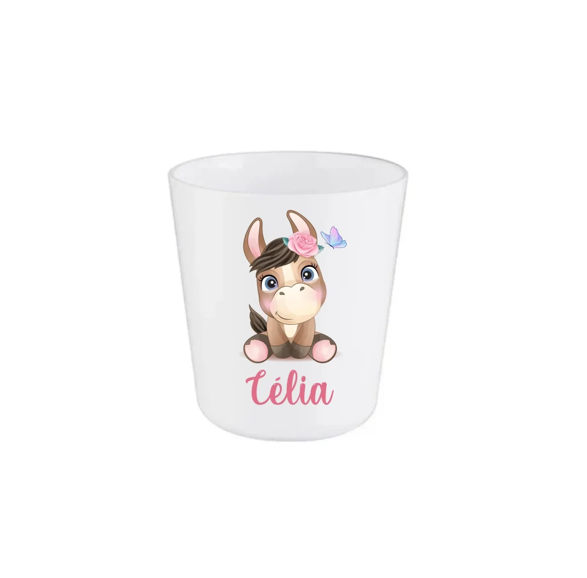 Ce gobelet personnalisé au prénom de votre enfant représente un petit âne attendrissant, coiffé d’une rose rose et accompagné d’un papillon. Un visuel plein de tendresse, idéal pour la crèche, l’école maternelle ou la maison.