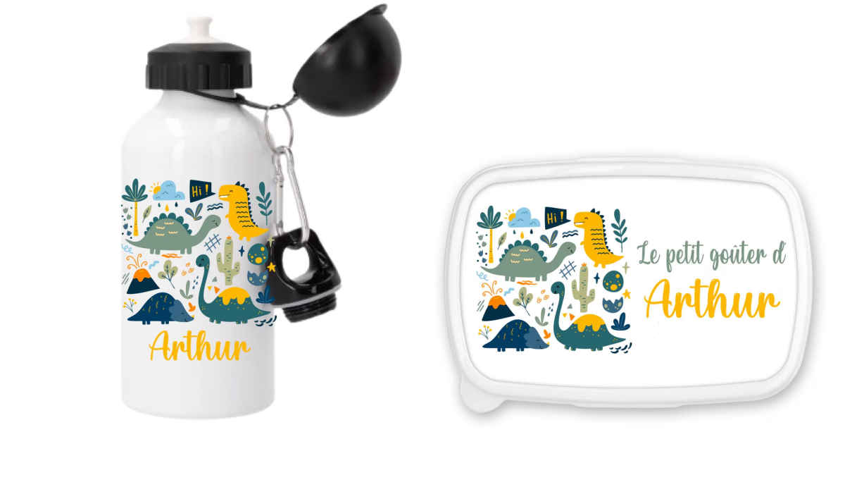 Préparez la rentrée scolaire avec cet ensemble pratique et personnalisé comprenant une gourde sport 500 ml et une boîte à goûter avec un joli fond bleu.