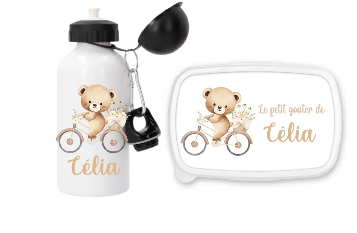 Offrez à votre enfant ce joli set composé d’une gourde sport 500 ml avec mousqueton et d’une boîte à goûter assortie au fond rose. Tous deux personnalisés avec un ours à vélo 🧸 et le prénom de votre enfant (exemple : Elio). Ce duo est idéal pour les repas et collations à l’école ou lors des activités sportives 🎒. La gourde est facile à transporter grâce à son mousqueton solide. La boîte à goûter offre un espace pratique avec un joli fond rose doux. Ces articles passent au lave-vaisselle pour un entretien facile 🧽. Un cadeau pratique, mignon et personnalisé qui ravira petits et grands !