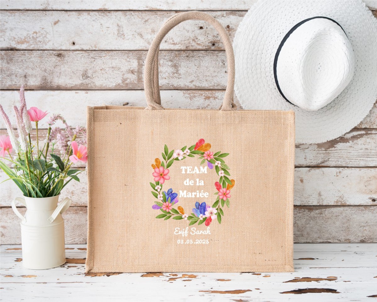 Avec sa couronne de fleurs éclatantes, ce sac personnalisable est un souvenir unique pour les invitées ou la future mariée.