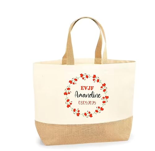 Un sac EVJF chic et pratique, à personnaliser selon votre événement ! Avec sa couronne de fleurs rouges et son impression au centre, ce modèle est parfait pour la future mariée comme pour ses invitées. ✔️ Grand format – 29 L ✔️ Élégant et robuste ✔️ Personnalisable à 100 % 📩 Merci de bien indiquer le texte souhaité lors de la commande.