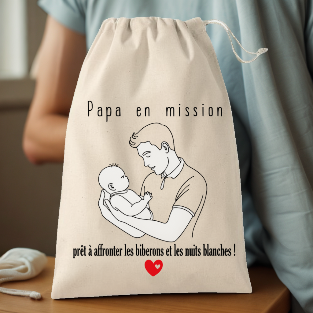 Le pochon seul beige présente une illustration adorable d’un papa 👨🍼 tenant tendrement son bébé 👶. Au-dessus, on peut lire « Papa en mission 🚀 », tandis qu’en dessous figure la phrase « Prêt à affronter les biberons 🍼 et les nuits blanches 🌙✨ ! ». Un petit cœur ❤️ complet l’ensemble, apportant une touche d’amour et de tendresse.