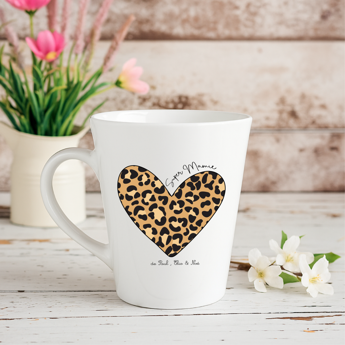 Ce mug conique en céramique “Super Mamie” est décoré d’un cœur léopard, symbole d’amour et de caractère, parfait pour une mamie exceptionnelle.