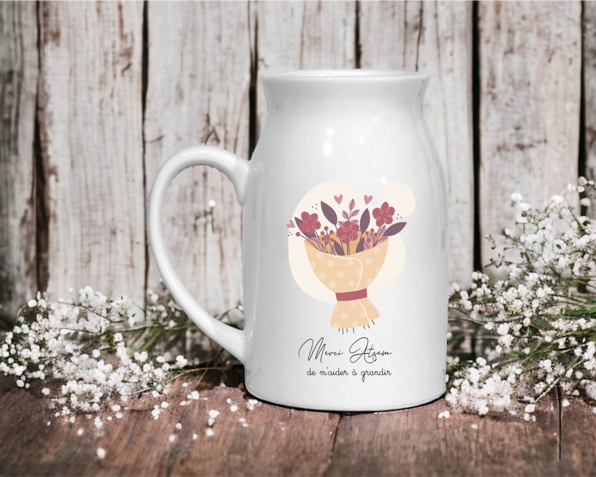 🌼 Offrez à votre Atsem bien-aimée un cadeau à la fois pratique et plein de charme avec notre adorable pot à lait, parfait pour célébrer la fin d’année scolaire ! 🥛 D’une capacité de 450 ml, ce pot à lait est idéal pour servir son lait préféré au petit-déjeuner ou à tout moment de la journée. Sa taille parfaite en fait également un vase délicat pour mettre en valeur de jolies fleurs fraîchement cueillies, ajoutant une touche de fraîcheur à n’importe quel espace. 💖 Son design doux et élégant est un hommage tendre à la douceur et à l’amour de votre maman . Avec son esthétique charmante, ce pot à lait apporte une touche de chaleur et de convivialité à sa cuisine ou à son salon. 🌸 Gravez le mot » Atsem » sur ce pot pour lui donner une touche personnelle et émouvante, faisant de ce cadeau un souvenir précieux qu’elle chérira pour toujours. 🎁 Que ce soit pour servir le lait au petit-déjeuner, pour exposer de magnifiques fleurs ou simplement pour ajouter une touche de douceur à son quotidien, notre pot à lait est le cadeau parfait pour honorer la douceur et la bienveillance de votre Atsem adorée. ✨ Offrez-lui un présent qui lui rappellera à quel point elle est spéciale et aimée,