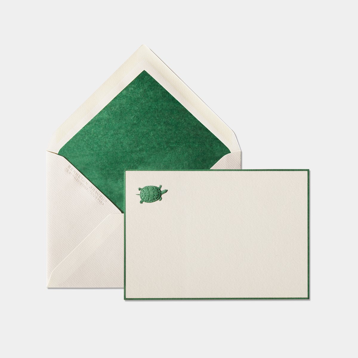 Benneton’s « sea turtle » correspondence cards, like all our floral, animal and fantasy cards, are hand-stamped on a hand press, card by card, using a technique known as “brushed stamping”.
