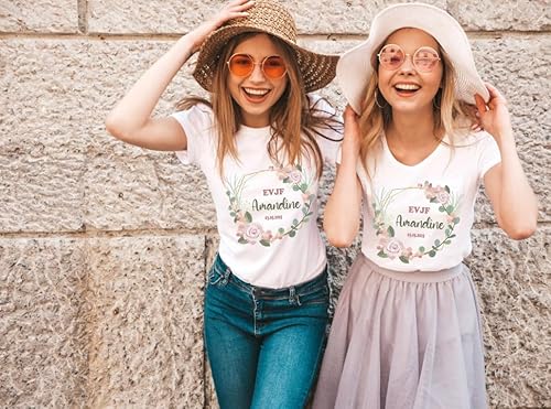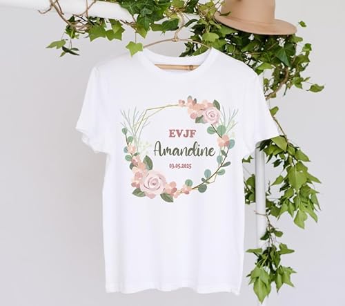 Ce t-shirt EVJF fleuri et personnalisable est le vêtement parfait pour célébrer la future mariée ! Orné d’une couronne florale élégante en rose et feuillage vert, vous pouvez y faire inscrire le prénom et la date de votre choix. 👚 Doux, confortable et joli en photo 💝 Idéal pour un look coordonné entre la mariée et sa team 🧵 Fabriqué et imprimé avec amour dans notre atelier français 🇫🇷 📩 Merci d’indiquer le texte à inscrire dans la couronne au moment de la commande.