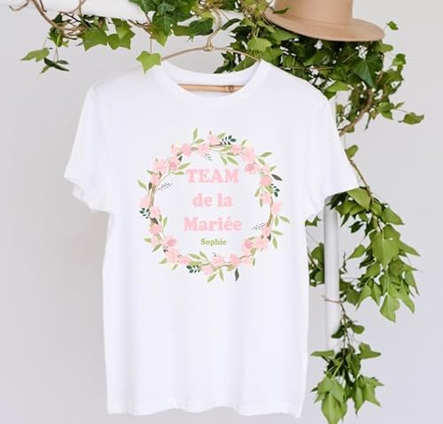 Ce t-shirt EVJF personnalisé avec couronne florale rose pâle et feuillage vert gris est parfait pour un EVJF élégant, coordonné et inoubliable 🌸 Idéal pour la mariée, sa team, les témoins ou amies proches ! 📩 Merci d’indiquer le texte à inscrire dans la couronne lors de votre commande.