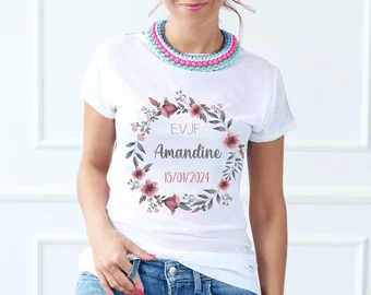 Notre tee-shirt, baigné dans des tons de rose délicats, est le choix idéal pour célébrer ce moment spécial avec style et confort. Le motif central de ce tee-shirt captivant est une magnifique couronne de fleurs qui symbolise la beauté éphémère et la joie partagée lors de cette journée mémorable.