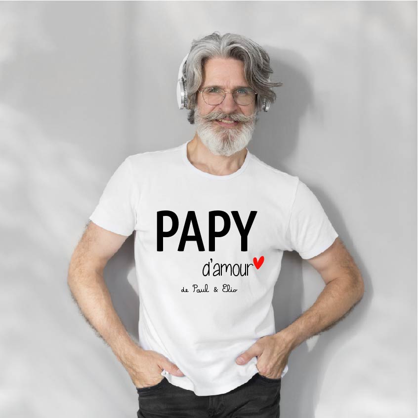 👕 Design : « Papy d’Amour de … » suivi des prénoms de ses petits-enfants pour un message unique et touchant.